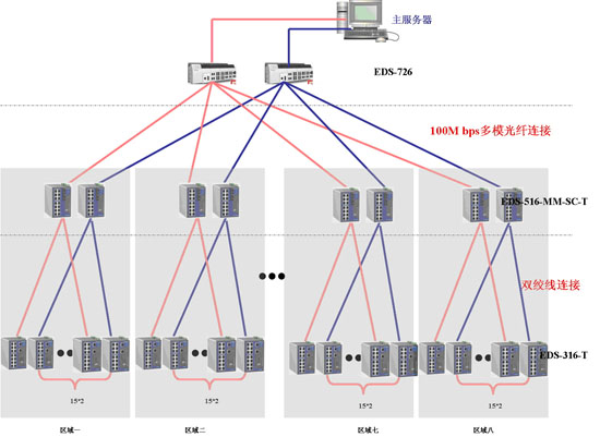 EDS-516A-MM-SC组成,负责连接现场层的EDS-316-T。核心层使用两台EDS- 726模块化交换机组成,负责