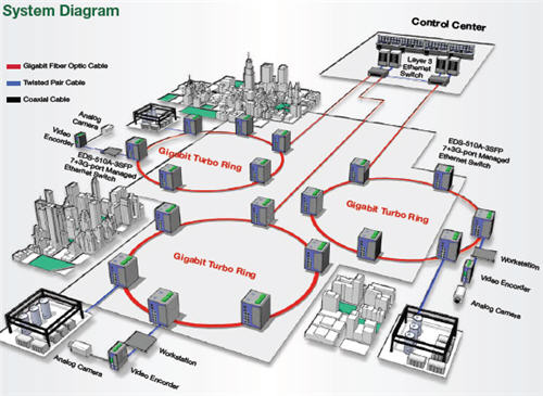 -510A-3SFP Gigabit 网管型以太网交换机建造了3个环形以太网。 这些环形以太网使用 Moxa 公司的