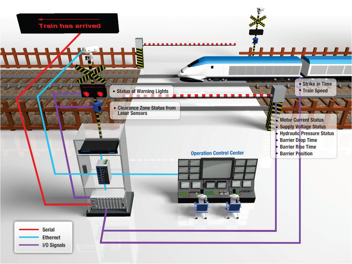 为了使铁路道口更智能,Moxa ioPAC 8500系列模块化RTU控制器可用于监控所有的报警设备,包括警灯、电铃、电闸、激光传感器和附近轨道电路的状态。由于其具备小巧的尺寸,适合安装在轨旁机柜中;此外,ioPAC 8500系列RTU控制器采用了模块化设计,可搭配一组多功能I/O模块,包括数字输入、数字输出、模拟输入、热电阻、热电偶,HSPA和串口模块,连接报警系统中不同接口的精密仪器和传感器。ioPAC 8500系列专为铁路应用量身定制,特别适合铁路道口监测系统的应用。