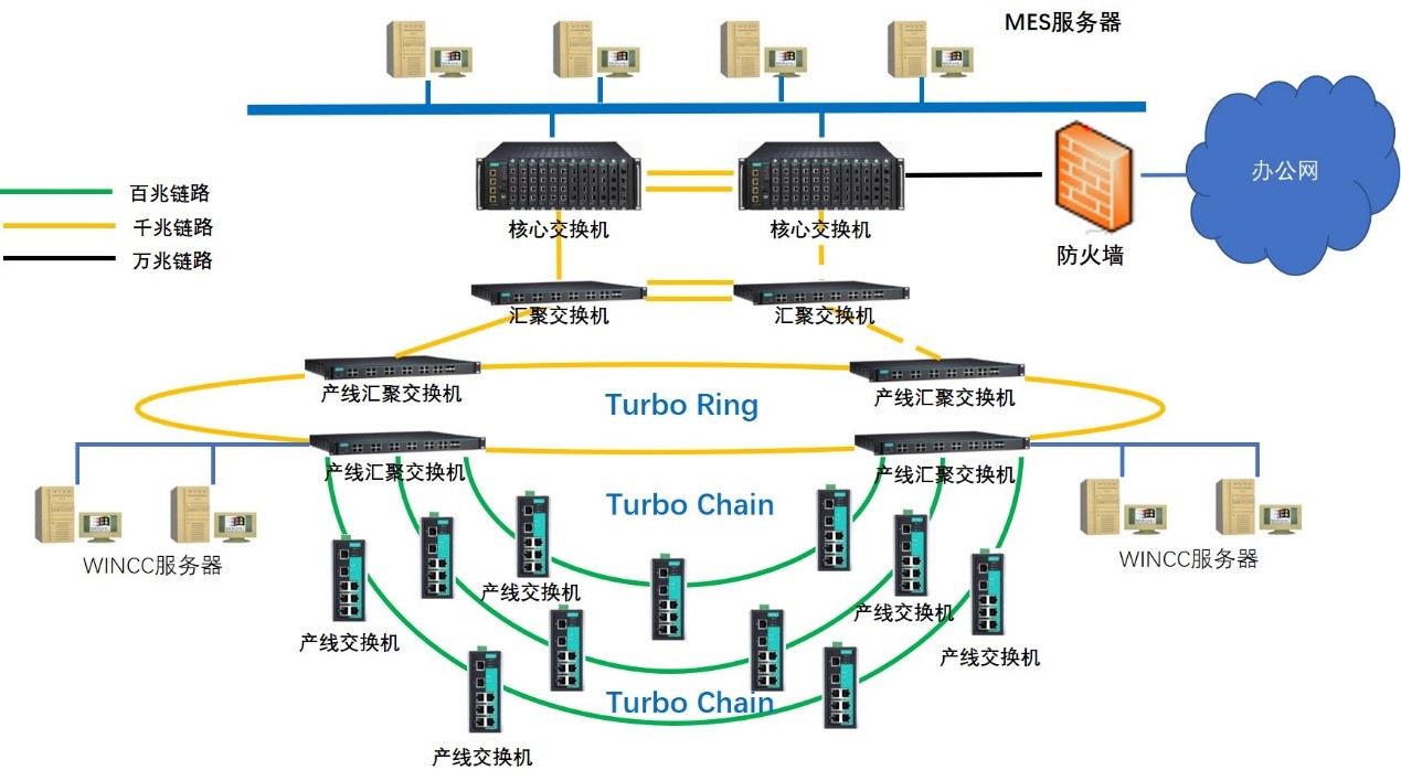 汇聚交换机和核心交换机之间用Ring Coupling 组环耦合。采用千兆光纤组网,避免单点故障。汇聚交换机采用三层交换机,可以给不同产线定义不同VLAN,设置不同的IP地址段,有效降低网络故障影响的范围。核心交换机也采用三层交换机,通过路由连接办公网络。