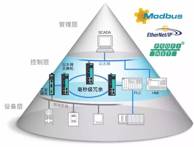 产线单元交换机、机柜交换机之间用百兆网口组网,机柜交换机和汇聚交换机之间用千兆网口组网,汇聚交换机和核心交换机之间用千兆光口组网。整个网络应采用基于交换方式的网络结构,并应考虑必要的冗余设计。