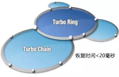 每层机柜的2台交换机和楼宇汇聚的2台交换机之间组turbo ring环网。采用双机热备及链路冗余,单台设备损坏及单条链路断线都不影响数据通讯。采用千兆光口组环,提供足够带宽传输。