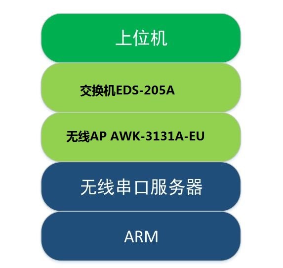 AGV小车在运行过程中通过多个无线 AP 来接入网络;同时在车间与车间、车间片区间无线漫游通讯。通过无线 AP 与 AGV小车 进行连接确保通信既稳定又快捷,无线串口服务器连接车载 ARM 与无线 AP 将数据传到工业以太网并连接到上位机管理系统,并与其进行数据监控与发送指令。