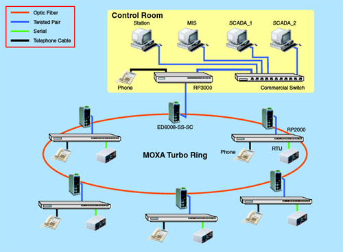 个光传输网络,完全满足了客户现场RTU数据和语音数据的传输。MOXA工业以太网交换机在电力行业中有
