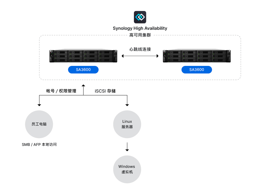 "部署群晖 SA3600 后,将员工原先分散的工作文件进行集中存储和统一管理,建立了部门共享文件夹以及对应的权限管理,这样不仅提升了办公效率,也减少文件丢失的风险。而通过将 SA3600 为 Windows 虚拟机进行扩容,也节省了扩容和管理成本。此外,为了避免意外故障导致业务数据丢失,通过群晖搭建高可用集群,一旦发生故障,也能迅速恢复业务,提升了公司的容灾能力。"