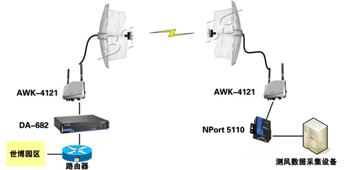 于现场对于无线AP的需求。在海面测风塔和岸边升压站中各设置一台AWK-4121,从而架构一个无线传输网