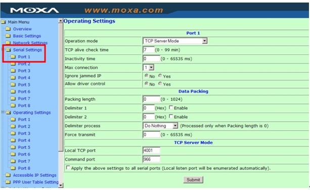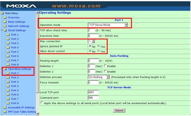 1. 打开浏览器,在地址栏键入IP地址。默认为:192.168.127.254,确认进入NPort 5000的WEB配置页面; 《br /> 2. 进入到配置页面: Main Menu --> Operating Settings --> Port n (这里的"n"表示需要配置的端口在NPort上的序号,例如:第一个口为port 1 );