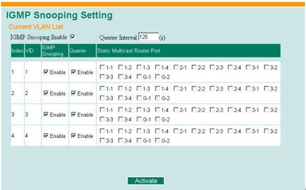 1. 设置 VLAN。 2. 启用 IGMP Snooping o IGMP Snooping Enable:选中,启用全局功能 o Querier Interval:设置全局查询的间隔时间 o IGMP Snooping:选中,启用每个VLAN 的 IGMP Snooping 功能