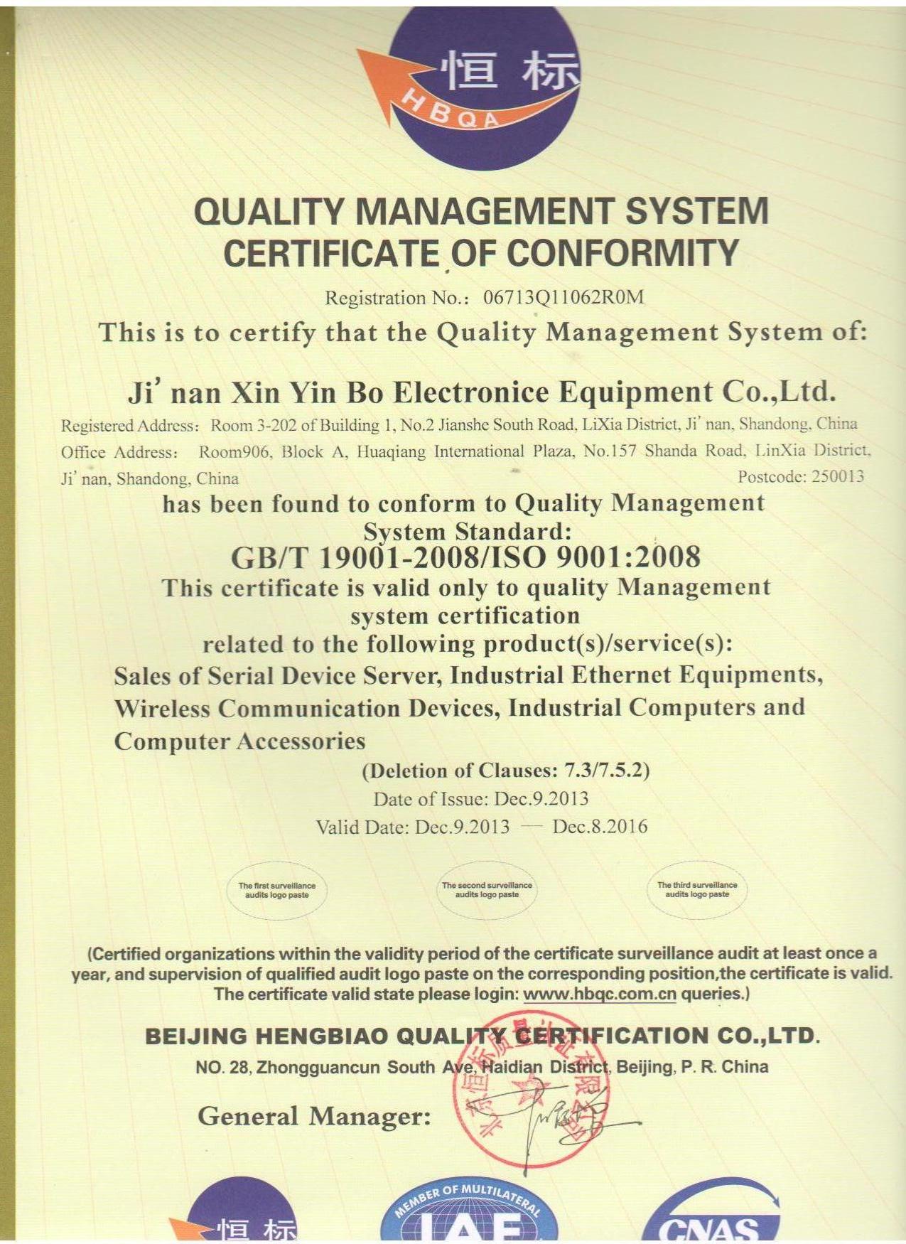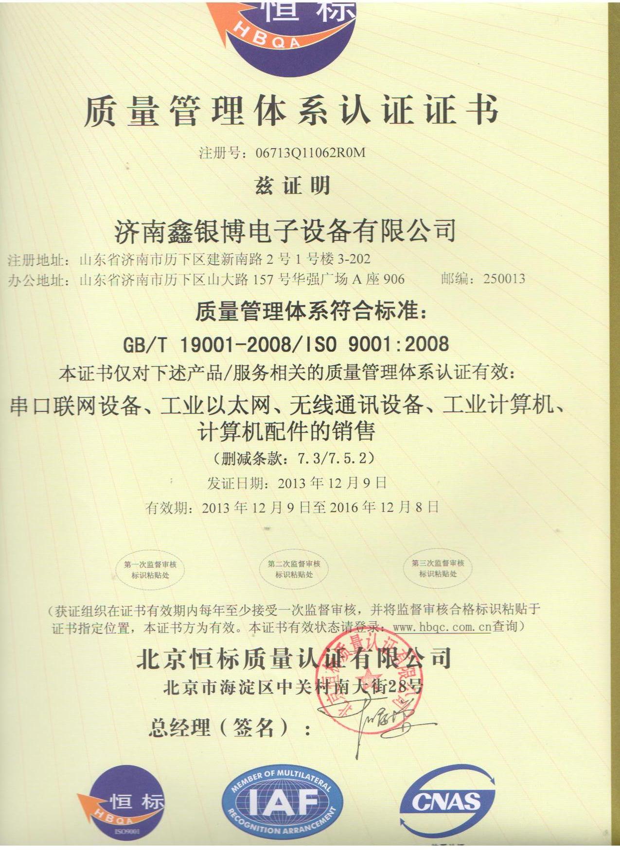 我公司于11月底已经通过ISO9000质量管理体系的认证,