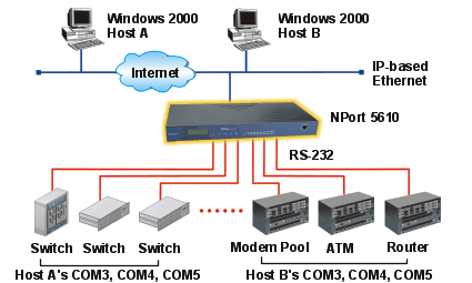 在安装完随机所带的NPort 5610的real COM/tty驱动程序后,NPort 5610上的串口会被Windows操作系统视为Real COM端口,或被Linux操作系统视为tty端口。NPort系列提供基本的传输/接收数据功能,以及RTS,CTS,DTR,DSR,和 DSD等控制信号功能。