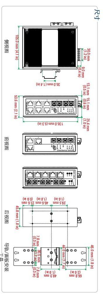 RJ45端口:10/100BaseT(X)自动协商速度,全/半双工模式,和自动MDI/MDI-X连接